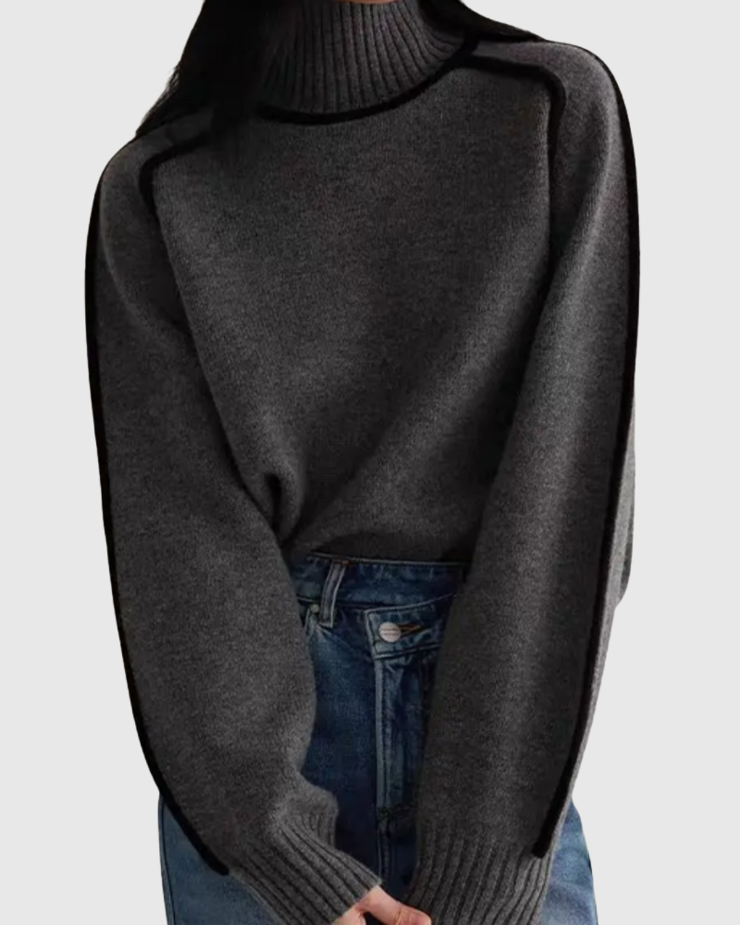 This stylish turtleneck sweater features clean lines and a relaxed silhouette, highlighted by bold contrast trim along the shoulders and sleeves. The wide ribbed neckline and cuffs add a touch of structure, while the soft knit drapes naturally for a flattering look. Paired with trousers or skirts, it’s a timeless piece that elevates everyday wear.